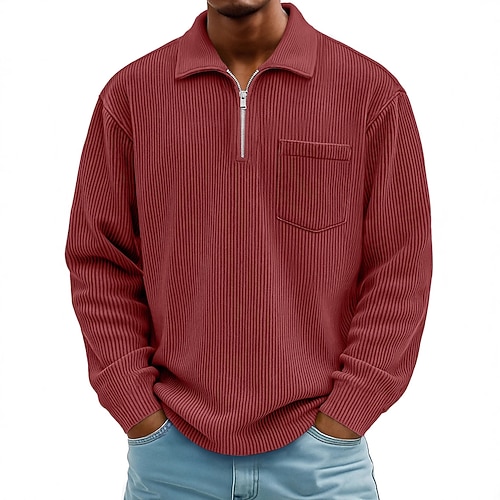 Per uomo Camicia di Velluto a Coste Testurizzato Vacanza Streetwear Zip a un quarto Manica Lunga Moda Essenziale Tinta unica Tasca Autunno Primavera Autunno Vestibilità regolare Nero Bianco Blu