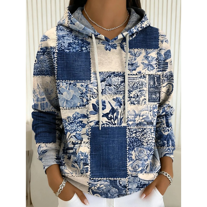 Women's Pullover Hoodies Floral Vintage Casual Long Sleeve Hooded Regular Tops Dailywear Casual Drawstring Patchwork Print Blue Beige Spring Fall