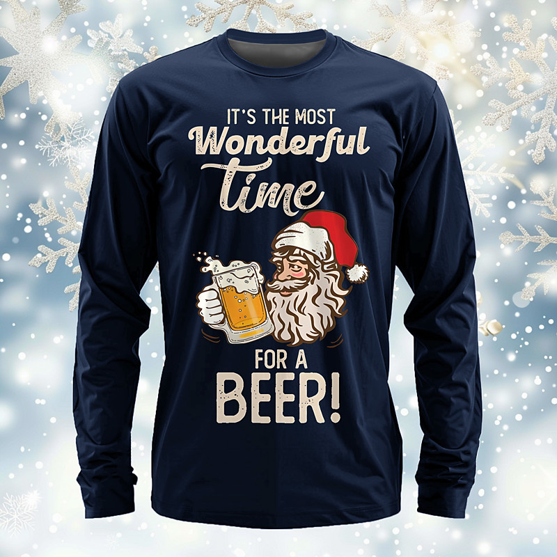 Christmas Men's Santa Claus Oktoberfest Beer T Shirt Long Sleeve T shirt 3D Print Crew Neck Shirt Daily Designer Festival Party Street Casual Black Burgundy Green Summer Spring Fall Clothing Apparel