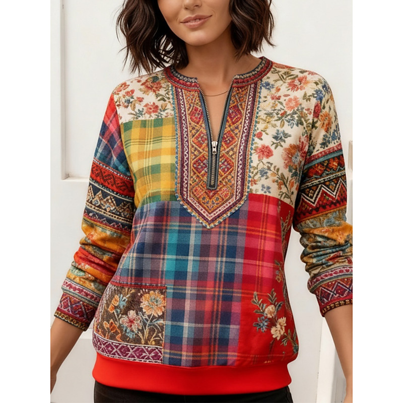 Women's Pullover Sweatshirt Zip Up Sweatshirts Floral Plaid Vintage Ethnic Long Sleeve Crew Neck Regular Tops Street Dailywear Casual Patchwork Zipper Print Yellow Spring Fall Winter