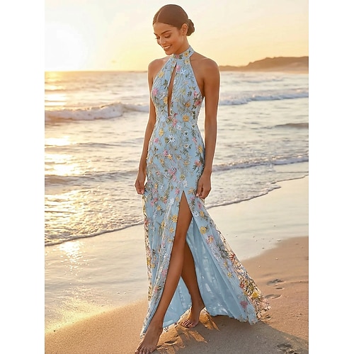 Linea ad A Lunghezza al pavimento Abito da Sera Elegante Scintillante Floreale Senza Maniche All'americana Festa serale Festa in giardino Chiffon Tulle con Fiore ricamato Perline Ricamo