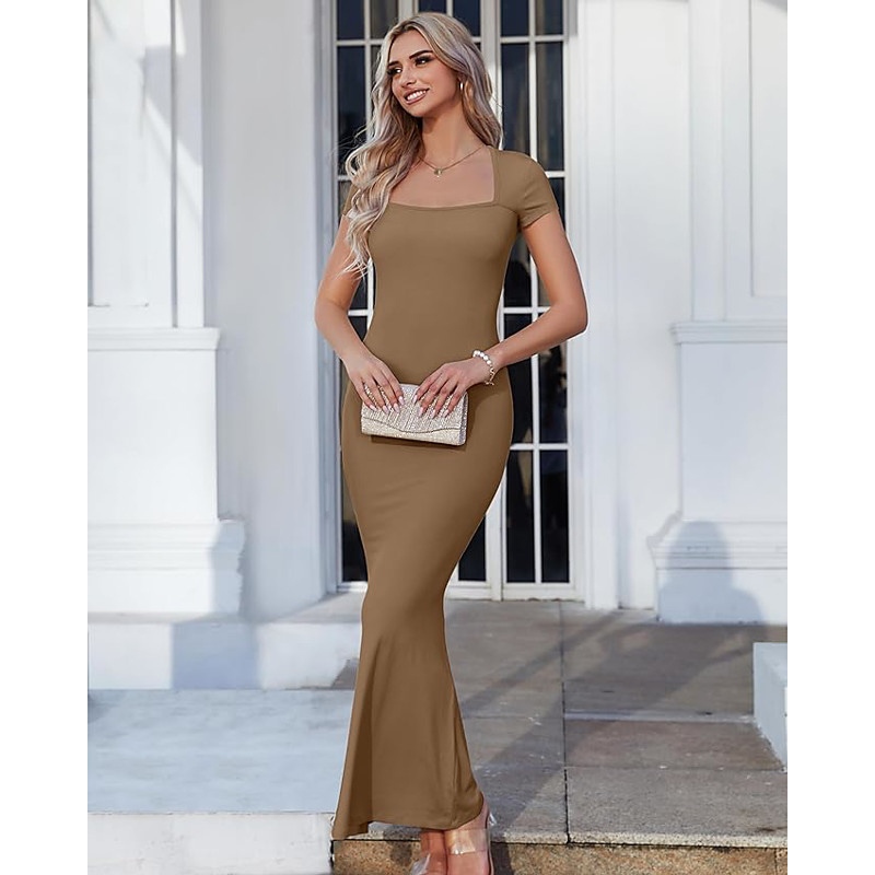Women's Short Sleeve Square Neck Threaded Slim Fishtail Long Dresses