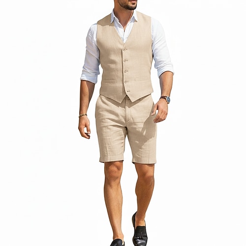 gilet in lino da uomo per feste e matrimoni in spiaggia pantaloncini leggeri scollo a V nero bianco casual tinta unita vestibilità slim 2 pezzi monopetto cinque bottoni
