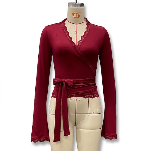 Per donna Blusa Semplice Elegante Sexy Manica Lunga Scollo a V Top Regolari Ferie Uscire Allacciato Bordo in pizzo Nero Rosa Vino Primavera Autunno