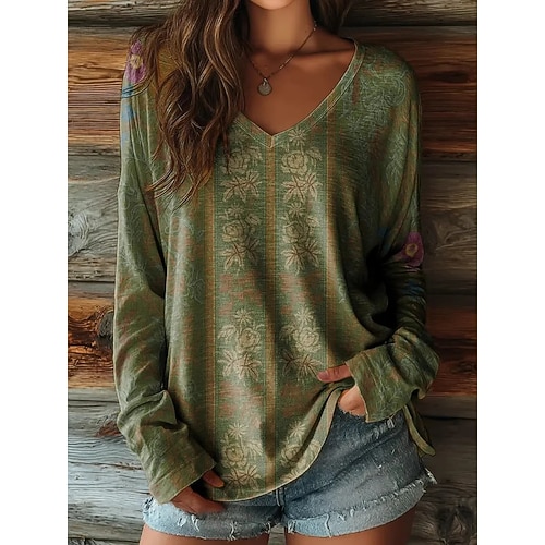 Per donna Maglietta Grafico Piante Tribale Vintage Elegante Classico Manica Lunga Scollo a V Top Regolari Quotidiano Stampato Blu Verde chiaro Vino Blu marino Fucsia Primavera Autunno Inverno