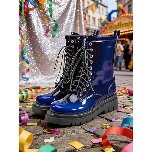Blaue Damen-Kampfstiefel aus Lackleder mit klobiger Sohle und Schnürung – auffälliges Schuhwerk für Karneval, Festivals und Freizeitaktivitäten