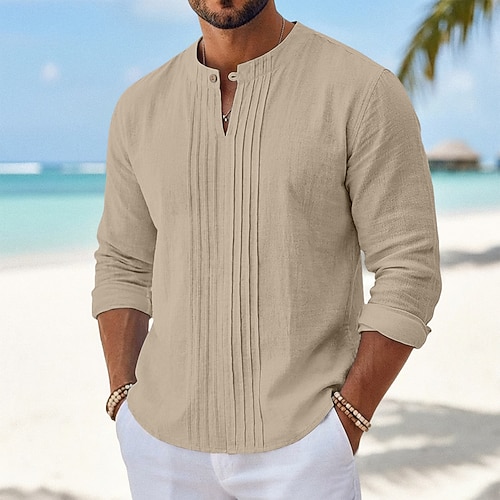 Per uomo Camicia Camicia di lino Camicia Estiva Camicia da Spiaggia Tinta unica Casuale Vacanza Blu Nero Bianco Cachi Manica Lunga Collo alla coreana Estate Abbigliamento Arricciato
