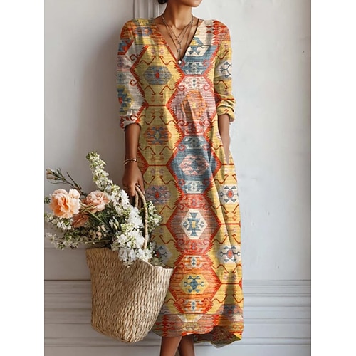 Per donna Abito maxi Vestito Estivo Abito a trapezio Vacanza Casual Boho Ferie Vestibilità regolare Floreale Grafico Blocco di colori Manica Lunga Scollo a V Blu Nero Arancione Estate Primavera