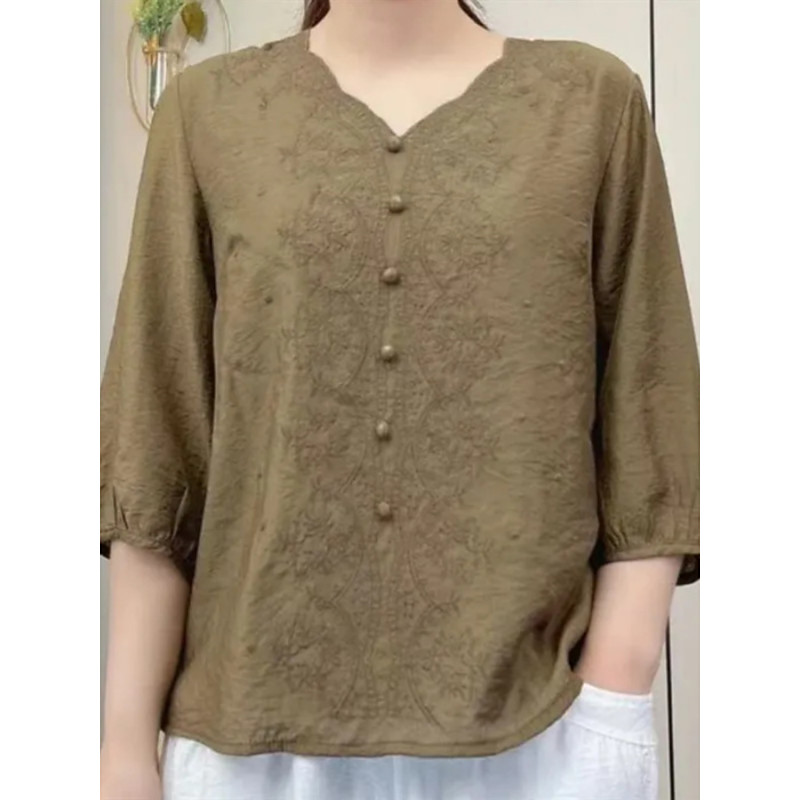 Women's Blouse Solid Color Daily Stylish Casual 3/4 Length Sleeve V Neck Regular Tops Daily Lace Embroidered Buttons Blue White Yellow Pink Navy Blue Summer Spring Fall