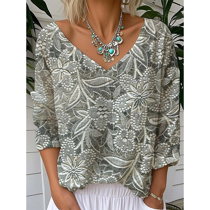 Women's Blouse Floral Graphic Plants Vintage Tropical Stylish 3/4 Length Sleeve V Neck Regular Tops Daily Going out Weekend Silver Gold Khaki Summer Spring