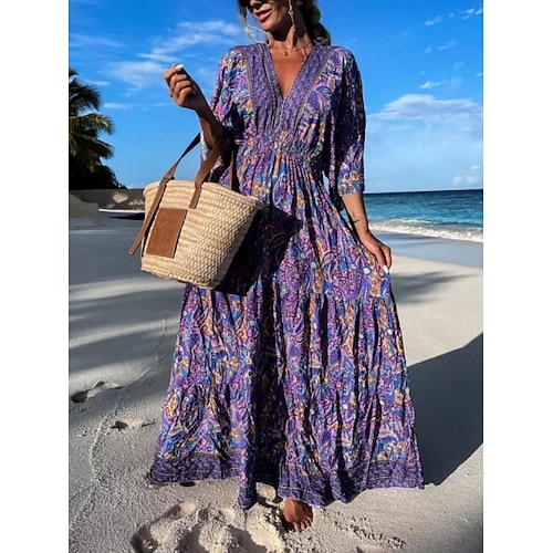Per donna Abito maxi Abito Boho Abito da Spiaggia Abito Floreale Elegante Moda Moderno All'aperto Vacanza Uscire Vestibilità comoda Floreale Manica Corta Scollo a V Viola Estate Primavera