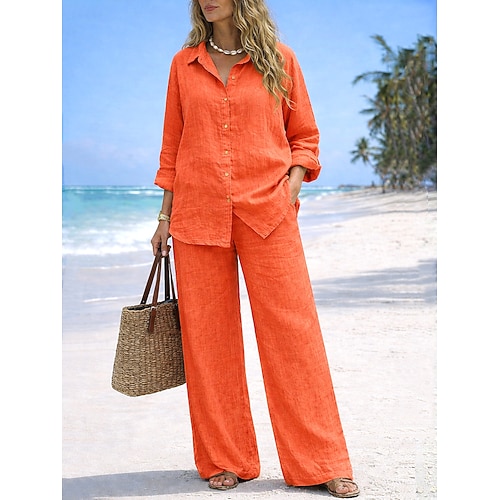 Per donna Set di Pantaloni Bolero Finto cotone e lino Manica Lunga Colletto a Camicia Tinta unica Moda Streetwear Casuale Quotidiano All'aperto Blu Nero Bianco Estate Vestibilità comoda