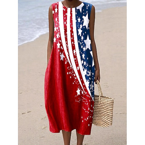 Giorno dell'Indipendenza Americana Per donna Abito Midi Abito a Tubino Vestito Estivo Vacanza Casual All'aperto Vestibilità comoda Stelle e strisce Senza Maniche Girocollo Bianco e blu Blu oceano