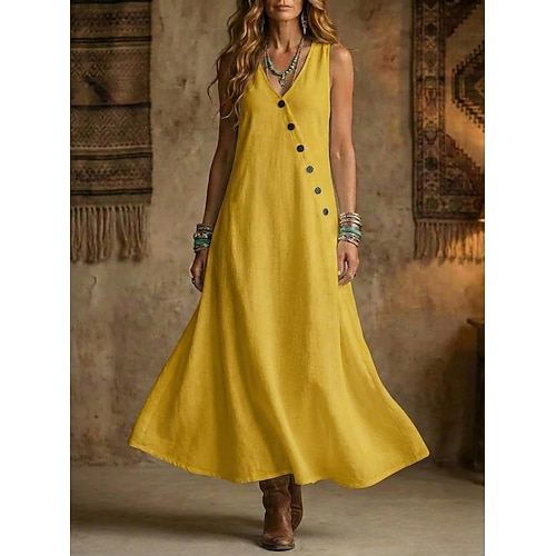 Per donna Abito maxi Finto cotone e lino Abito Estivo Abito Sottoveste Casual Quotidiano Vestibilità comoda Semplice Senza Maniche Girocollo Blu blu navy Giallo Rosa Estate Primavera