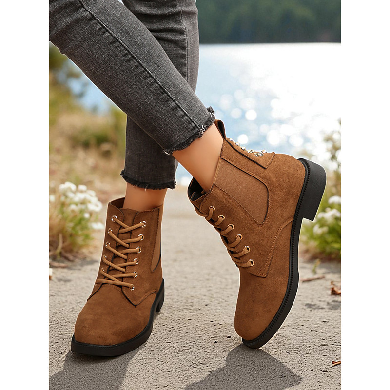 Women's Brown Lace-Up Ankle Boots - Combat Style Flat Boots, Casual Outdoor Footwear for Fall, Travel and Everyday Wear