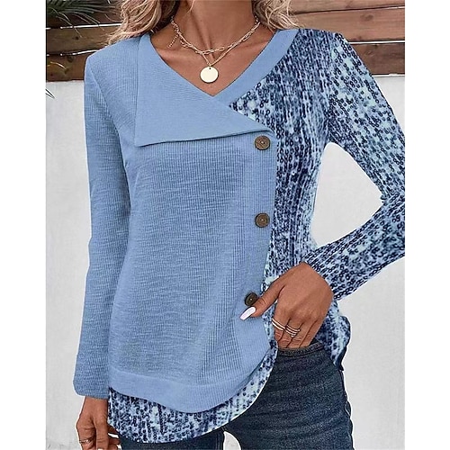 Per donna Blusa Top Eleganti Semplice Astratto Elegante Vintage Signore Manica Lunga Scollo a V Top Regolari Lavoro Quotidiano Ferie Paillettes Arricciato Bottoni Blu Azzurro cielo Viola Arancione