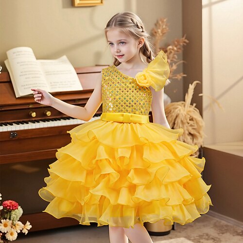 Abito da damigella d'onore bambina Ragazze Abito formale Abiti da sposa Feste Matrimonio Formale Elegante Adorabile Principessa Patchwork Rete Tinta unica Senza Maniche Girocollo Giallo Rosa Dai 4