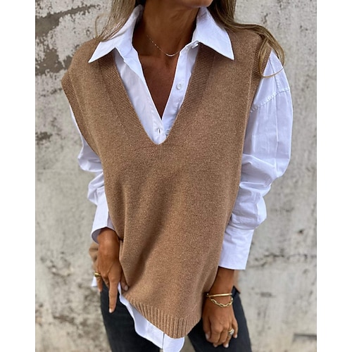 Per donna Gilet Casual Tinta unica A Coste Scollo a V Lavorato a maglia Senza Maniche Top Regolari Maglia Uscire Weekend Nero Marrone Autunno