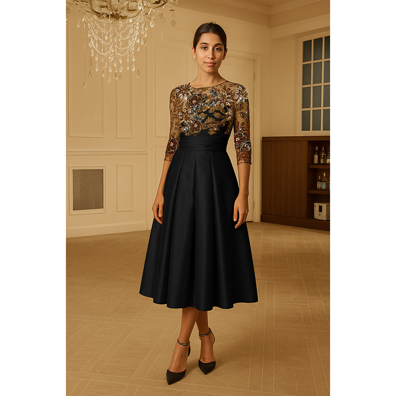 A-Line Tea Length Beaded Eembroidered Formal Dresses Mother of the Bride Dress Cocktail Dresses Party Dresses Elegant 3/4 Length Sleeve Crew Neck Garden Party Wedding Satin Lace with Pleats Beading