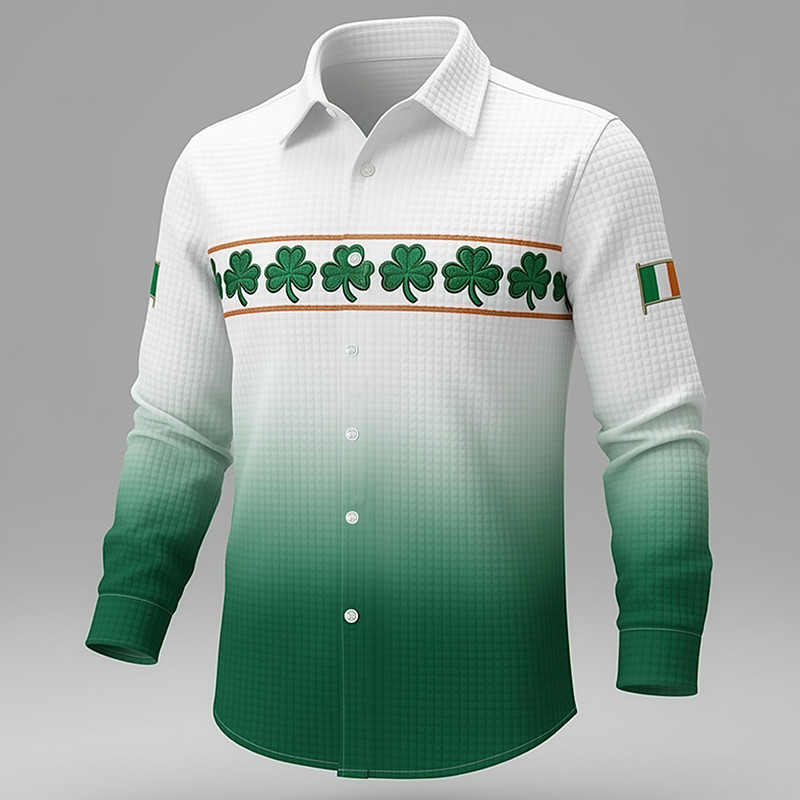 St. Patrick's Day Men's Shamrock Gradient Color Irish Flag Shirt Waffle Shirt Casual Shirt Long Sleeve Vintage Retro Holiday Summer Spring Turndown 3D Print Textured Button Up Shirts Blue Orange Green