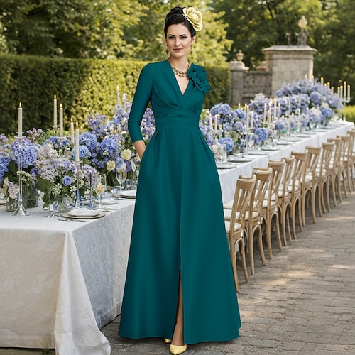 Linea ad A Lunghezza al pavimento Abito da invitata a nozze Abito Formale Abito svasato Abito da cerimonia per signora Manica 3/4 Scollo a V Elegante Ospite di nozze Festa di fidanzamento Raso Pizzo
