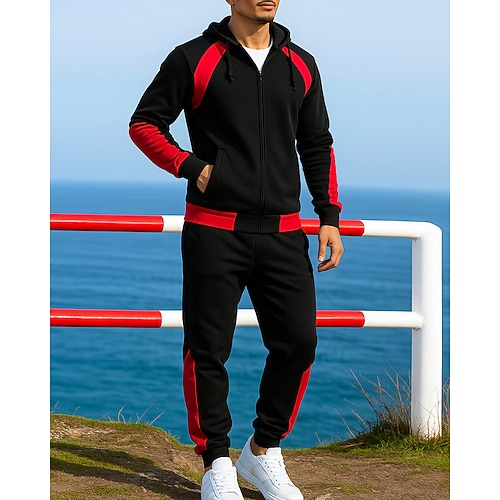 Per uomo Tuta da Jogging Felpa con zip intera Tute sportive Con cappuccio con tasca Blocco di colori Completo Abbigliamento Autunno Inverno Nero Vino Escursionismo Lavoro Viaggio Manica Lunga Sport
