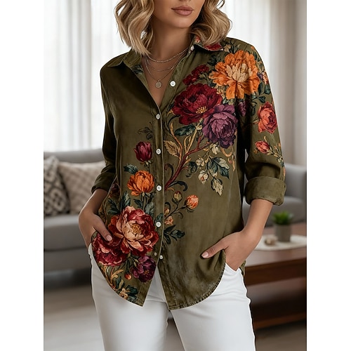 Per donna Camicia Floreale Elegante Casual Manica Lunga Colletto a Camicia Top Regolari Lavoro Quotidiano Ferie Bottoni Stampato Vino Blu marino Verde Primavera Autunno