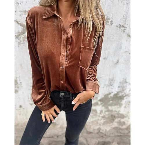 Per donna Camicia Velluto Elegant Elegante Semplice Elegante Signore Romantico Manica Lunga Colletto a Camicia Top Regolari Lavoro Quotidiano Ferie Tasca Bottoni Drappeggiato Vino Verde militare