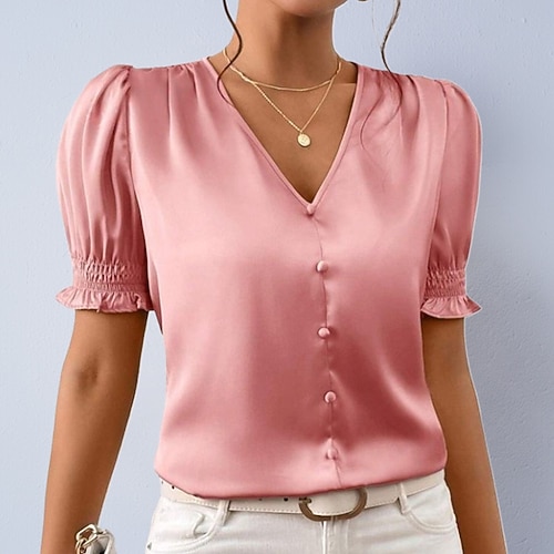 Damen Hemd Satinbluse Kleidhemd Einfarbig Einfach Elegant Mode Lässig Kurzarm Puffärmel V Ausschnitt Normale Oberteile Streetwear Büro Arbeit Blau Schwarz Weiß Champagner Hellgrün Sommer Frühling