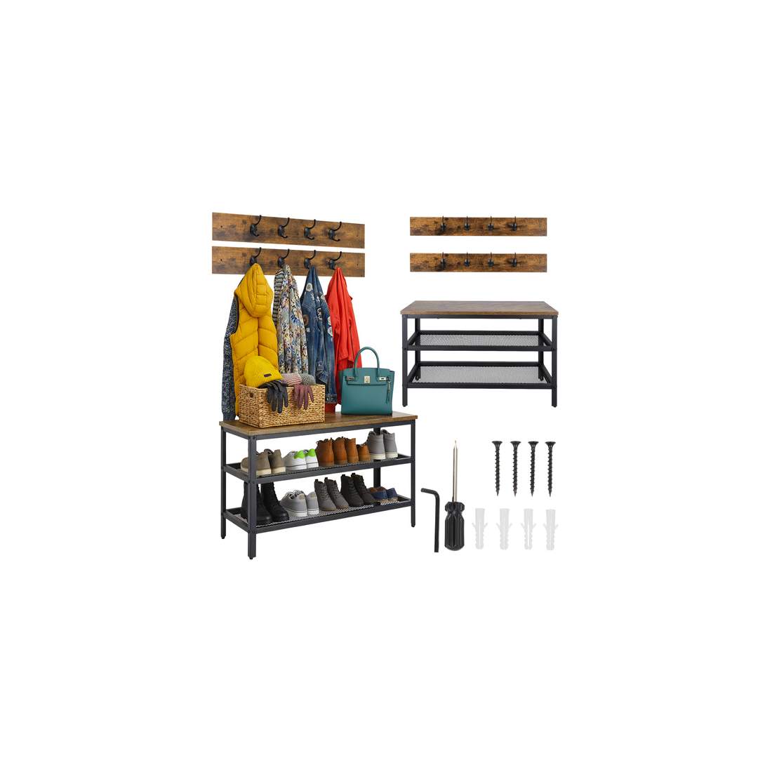 Skohyllebenk med henger – 2 hyller, industriell stil