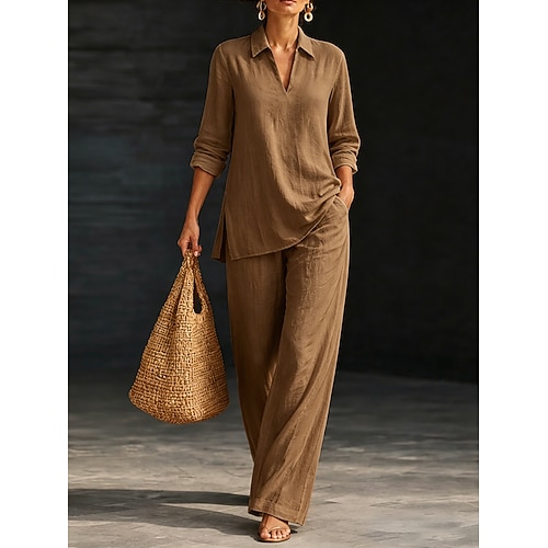 Set di pantaloni in cotone e lino da donna Bolero Top Camicia a maniche lunghe Colletto Colore solido Moda Streetwear Casuale Quotidiano Outdoor Blu Nero Bianco Estate Vestibilità ampia