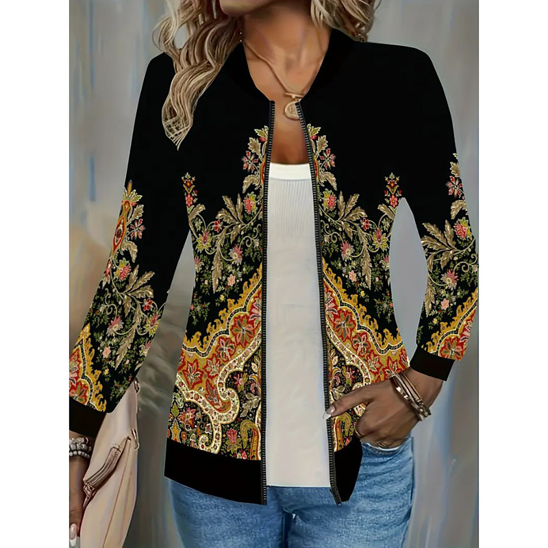 Women's Casual Jacket Warm Quick Dry Zipper Pocket Elegant Fashion Daily Simple Floral Vacation Casual Daily Holiday Regular Baseball Collar Regular Fit Long Sleeve Outerwear Black Gold Black Dark