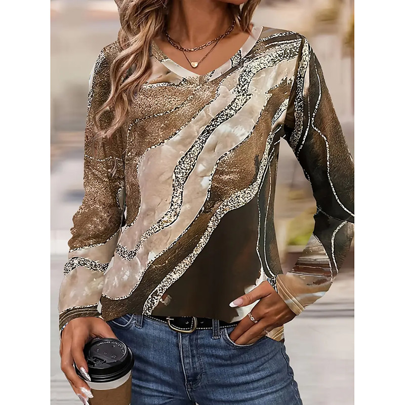 Women's T Shirt Ombre Graphic Vintage Stylish Casual Long Sleeve V Neck Regular Tops Daily Print Brown Spring Fall Winter