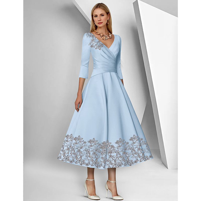 A-Line Tea Length Party Dress Cocktail Dress Wedding Guest Dress Mother of the Bride Dress 3/4 Length Sleeve V Neck Elegant Vintage Formal Satin with Lace Solid Color