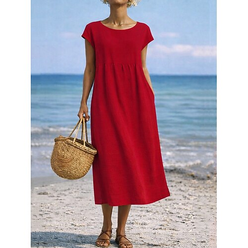 Per donna Abito Midi Finto cotone e lino Abito a Tubino Abito estivo in cotone Casual Quotidiano Vacanza Vestibilità comoda Semplice Mezza Manica Girocollo Nero Rosso Blu marino Verde Estate Primavera