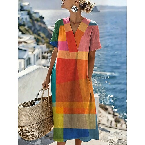 Per donna Abito Midi Vestito Estivo Vestito Casual Vacanza Casual Spiaggia Spiaggia Feste Vestibilità comoda Grafico Geometrico Manica Corta Scollo a V Rosa Viola Arancione Estate Primavera