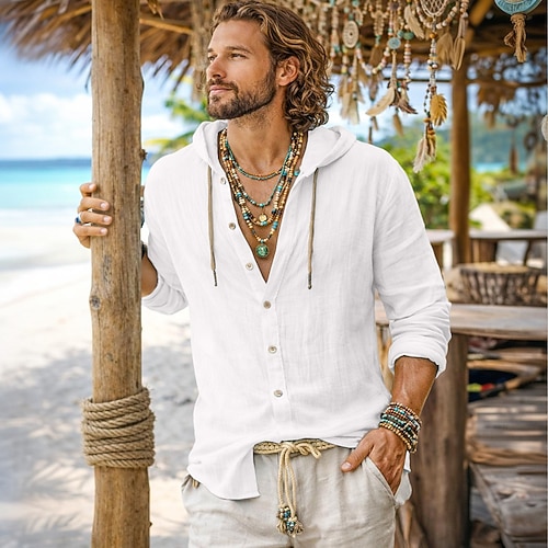 Per uomo Camicia Camicia di lino Abbigliamento da spiaggia Camicia con Bottoni Camicia con cappuccio Semplice Casuale Quotidiano Nero Bianco Cachi Verde militare Manica Lunga Con Cappuccio Estate