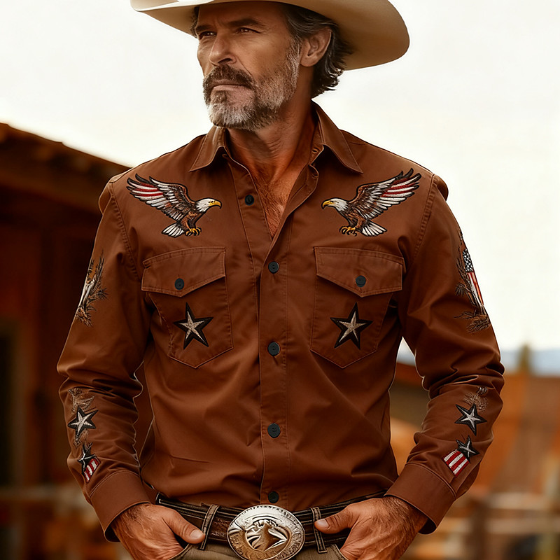 Men's Stars Eagle US Flag Shirt Western Shirt Cowboy Shirt Long Sleeve Vintage Retro Outdoor Casual WorkWear Spring Fall Turndown Front Two Pockets Linen Like Shirt Button Up Shirts Army Green Brown
