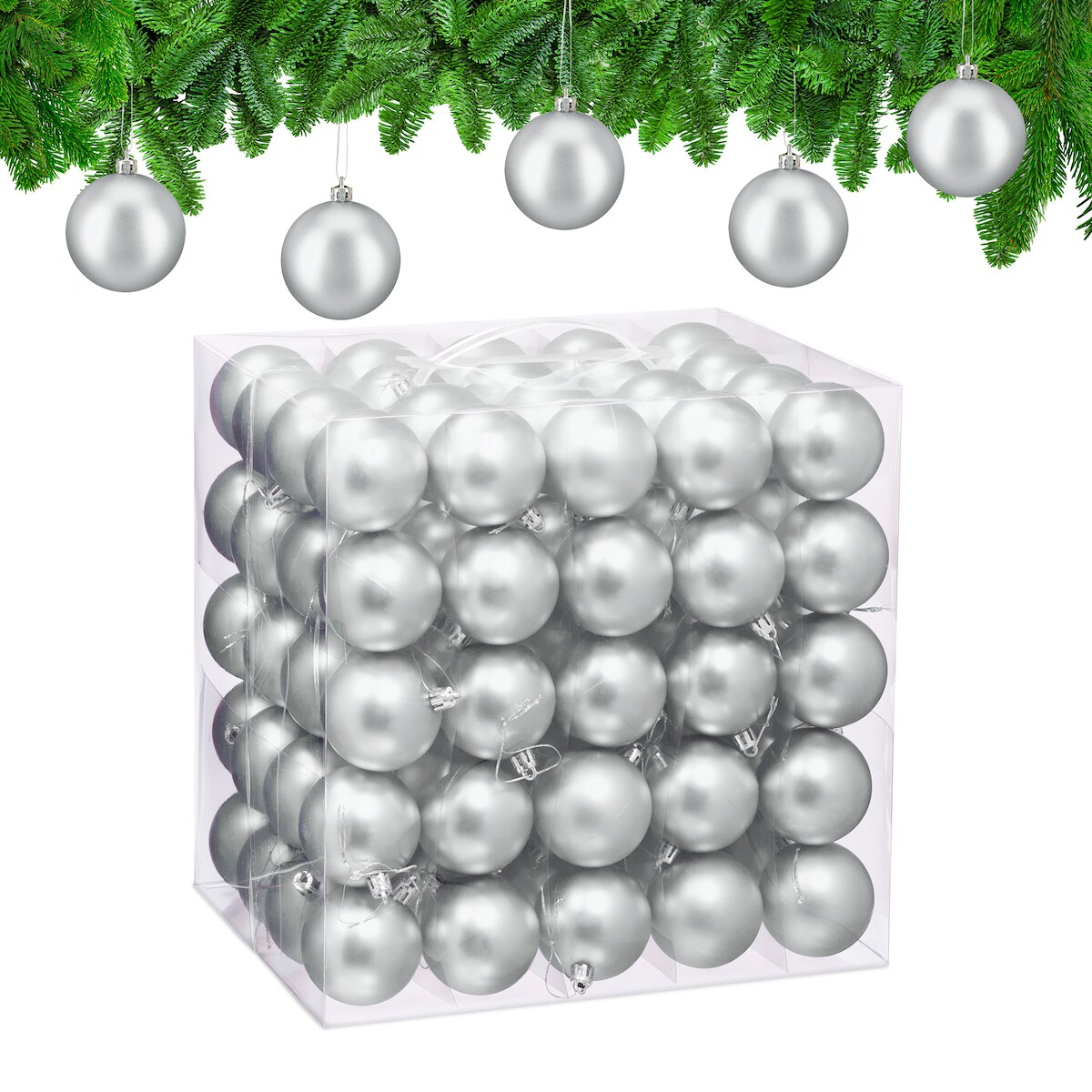 Relaxdays Weihnachtskugeln 100er Set, Weihnachtsdeko, mattes Design, Christbaumkugel, Tannenbaumschmuck ∅ 6 cm, silber