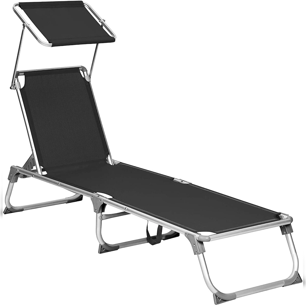 UAC Sonnenliege mit Sonnendach 55 x 193 x 31 cm, 5-Positonen verstellbare Rückenlehne, bis 150 kg belastbar, Liegestuhl, tragbar faltbar, schwarz