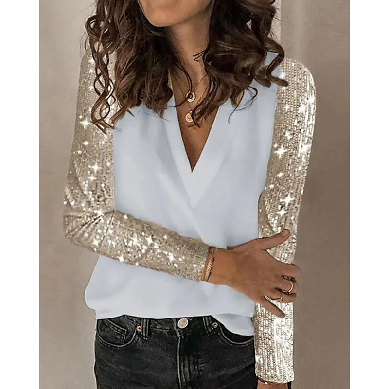 Women's Blouse Dressy Tops Sequin Tops Plain Elegant Vintage Ladies Long Sleeve V Neck Regular Tops Daily Work Holiday Ruched Sequins Patchwork Blue Black Navy Blue Apricot Beige Spring Fall