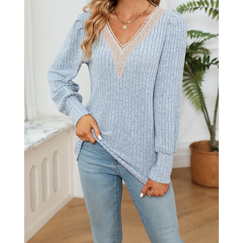 Per donna Maglietta Tinta unica Casual Manica Lunga Scollo a V Top Regolari Quotidiano Uscire Weekend Patchwork Nero Vino Verde militare Blu marino Cachi Primavera Autunno
