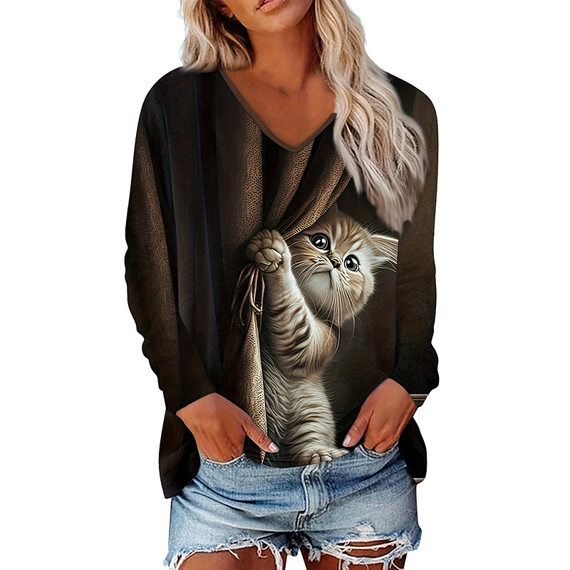 Women's T Shirt Graphic Animal 3D Vintage Stylish Classic Long Sleeve V Neck Regular Tops Daily Print Brown Fall Winter