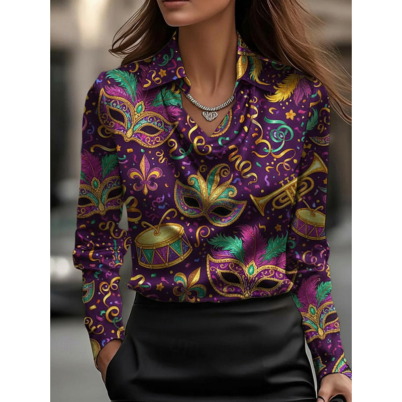 Carnival Women's Shirt Graphic Vintage Casual Long Sleeve Cowl Neck Regular Tops Daily Work Holiday Print Draped Purple Spring Fall