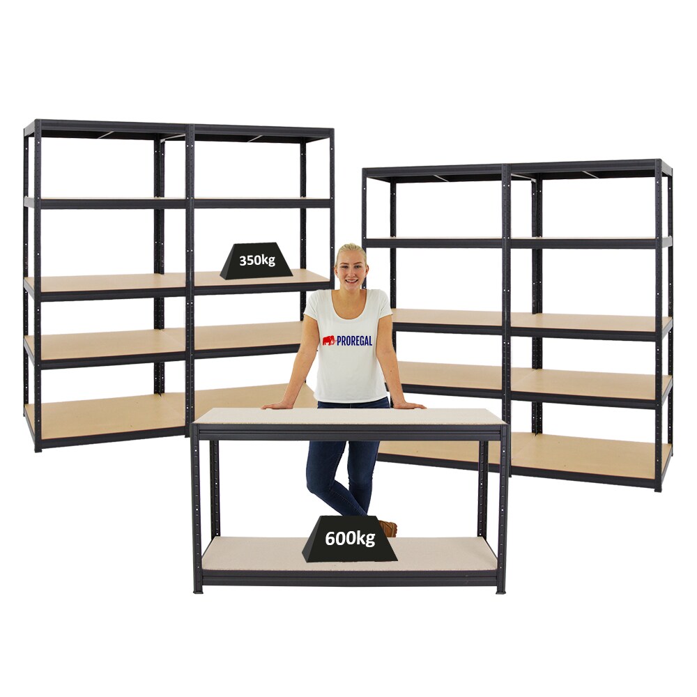 PROREGAL Mega Deal | 4x Schwerlastregal Slim Elephant M & 1x Höhenverstellbare Werkbank Big Dino| Fachlast bis zu 600kg | Schwarz | Stecksystem