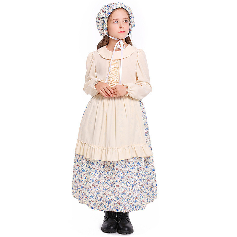 Book Week 2026 19th Century 1800s Prairie Dress Bonnet and Apron Set Long Sleeves Pioneer Floral Print Fancy Dress Girls' Halloween Carnival School Event Dress Up Historical reenactment Kid's Dress