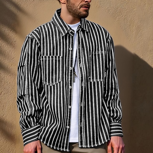 Per uomo Camicia Camicia casual Camicia con Bottoni Camicia di Jeans Nero Blu Manica Lunga A righe Bavero Vacanza Ferie Tasca Abbigliamento Poliestere Moda Casual Confortevole
