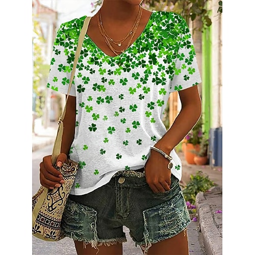 Maglietta da donna portafortuna per il giorno di San Patrizio, grafica, trifoglio, vintage, elegante, classica, manica corta, scollo a V, top normali, stampa quotidiana, nero, bianco, verde, estate,