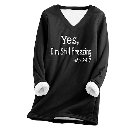 felpa da donna con fodera in pile, felpa da pigiama, felpa con cappuccio, sì, ho freddo, lettera, streetwear, casual, manica lunga, scollo a V, top normali, casa, strada, vacanza, stampa, nero, rosa, blu navy, grigio chiaro