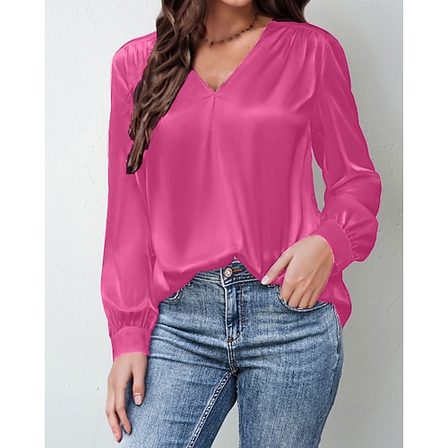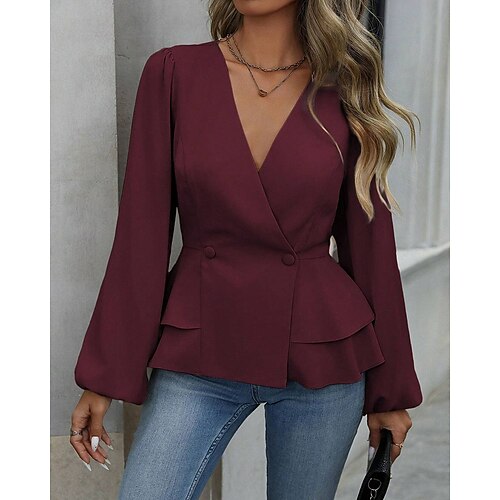 Per donna Camicia Blusa Semplice Elegante Casual Manica Lunga Scollo a V Top Regolari Quotidiano Lavoro Ferie Arricciato Bottoni Nero Vino Verde militare Blu marino Albicocca Estate Primavera Autunno